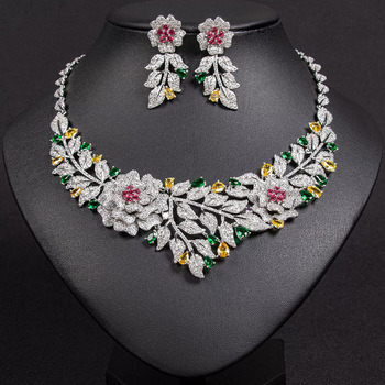Sang Trọng Lớn Hoa Phụ Nữ Wedding Party Ăn Mặc Đồ Trang Sức Cô Dâu Cubic Zirconia Vòng Cổ Bông Tai Đồ Trang Sức Bộ S-0029